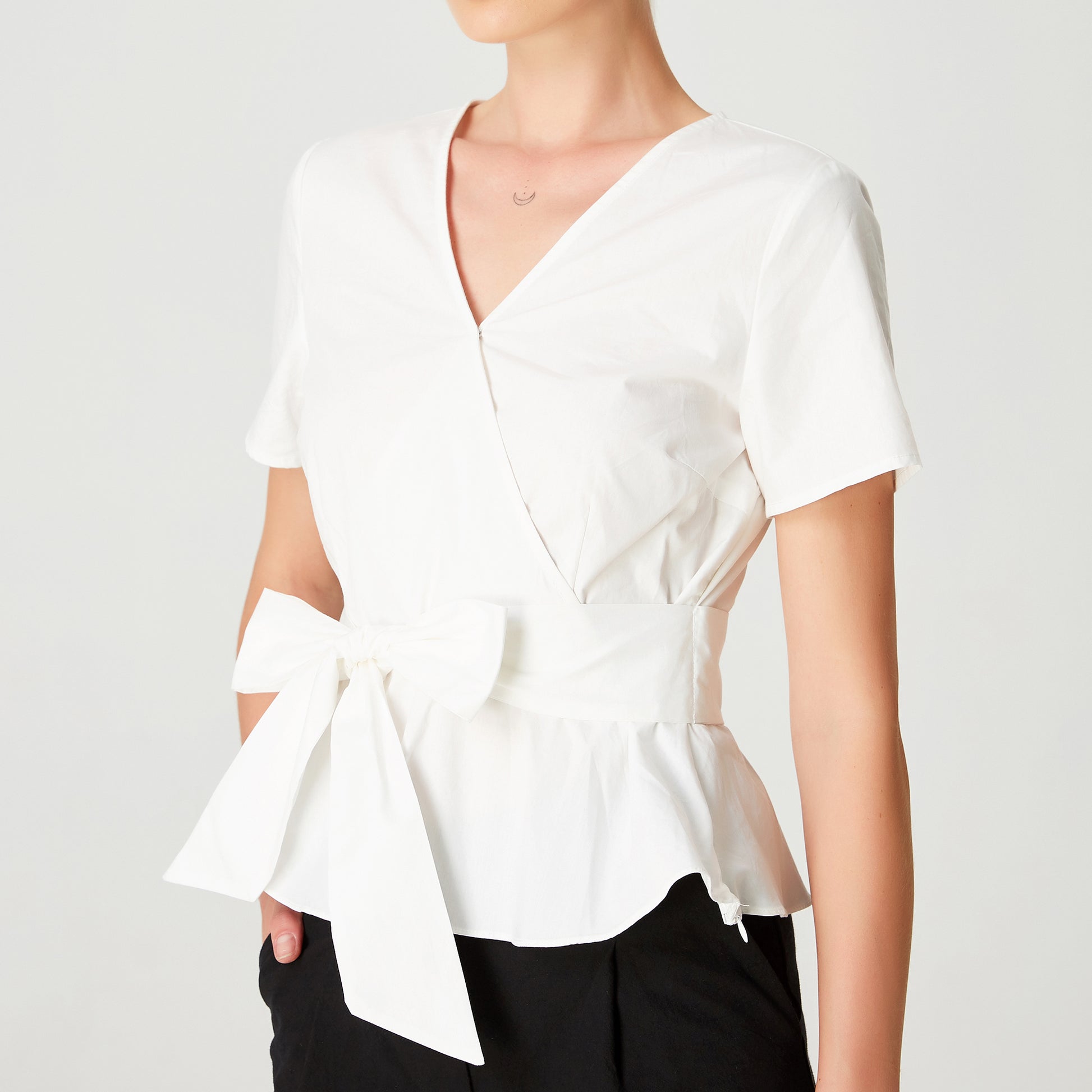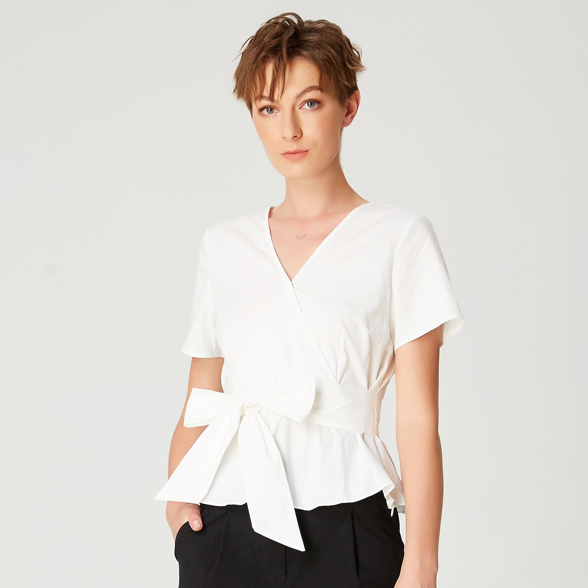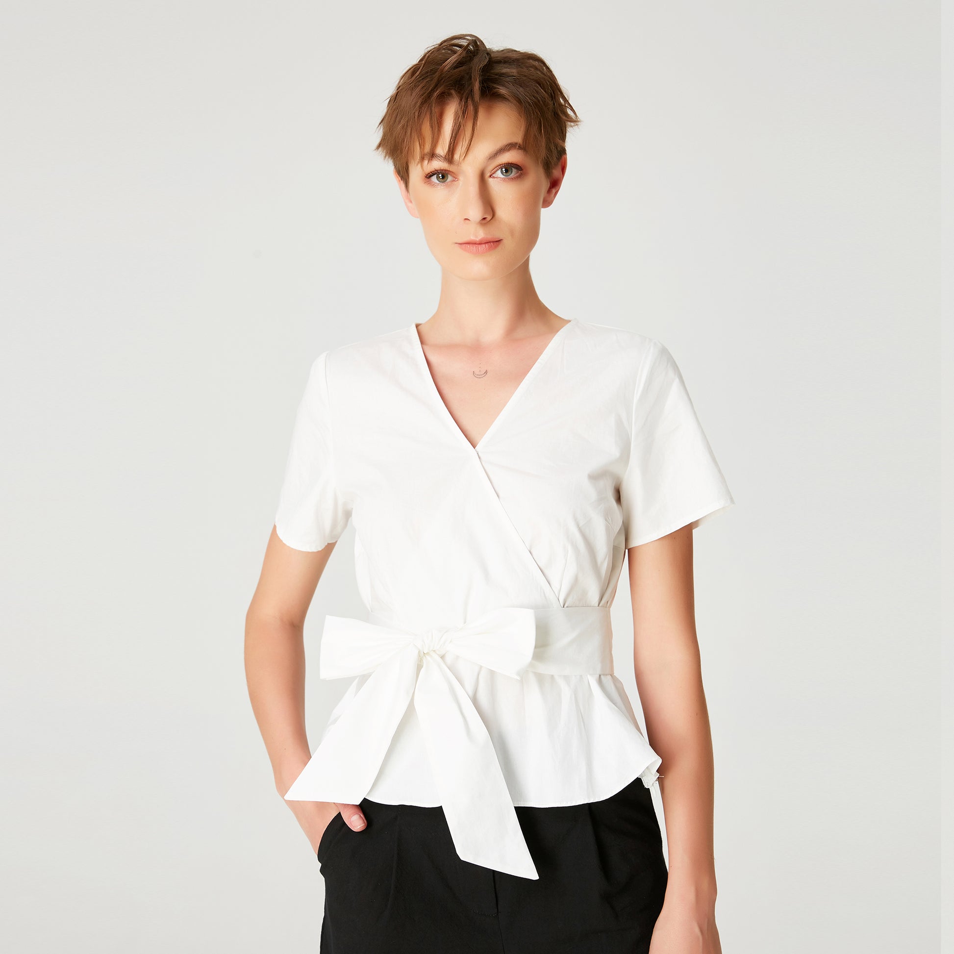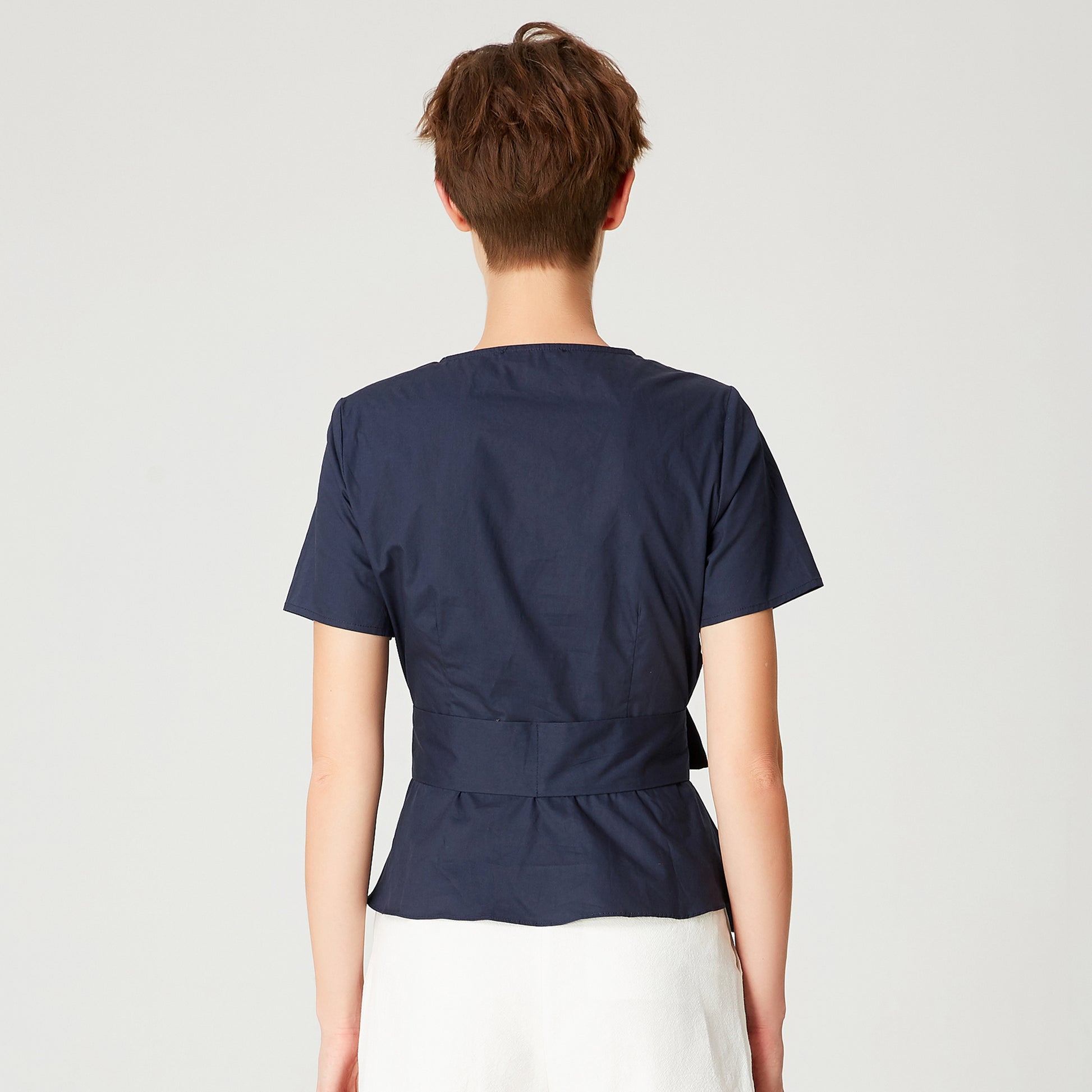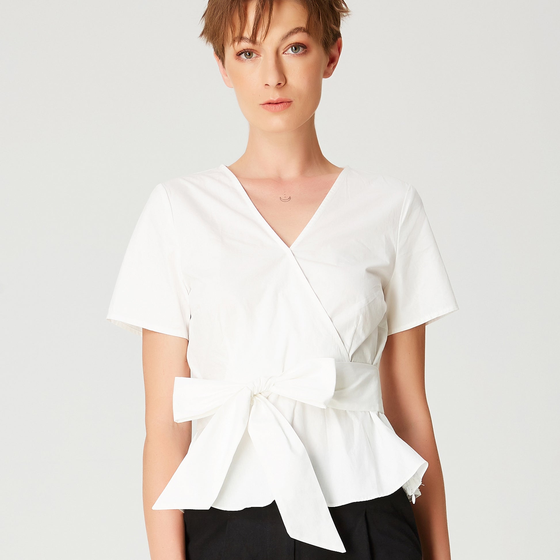 Une coupe féminine et raffinée, ce top s’agrémente d’une large ceinture à-même à nouer, soit devant, soit au dos au grès de vos envies. Le buste est élégamment mis en valeur par l’encolure en v avec effet cache cœuret les pinces poitrines. A associer avec une jupe droite ou un pantalon cigarette.