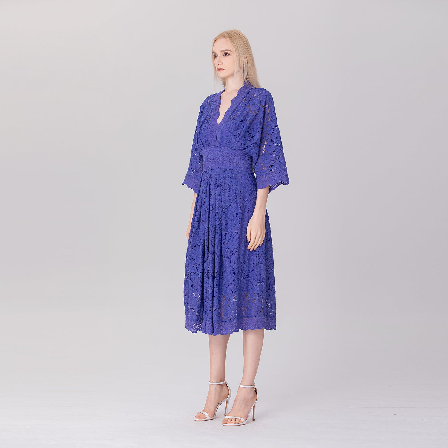 Romantique et élégante, cette robe en dentelle à col V et manches kimono est une pièce qui attire tous les regards. Son délicat voile de dentelle joue avec la transparence, tandis que ses manches kimono amples apportent fluidité et raffinement. Entièrement doublée pour plus de confort, elle sublime la silhouette grâce à une taille ajustée et une jupe fluide — idéale pour une cérémonie, une soirée ou toute occasion habillée.