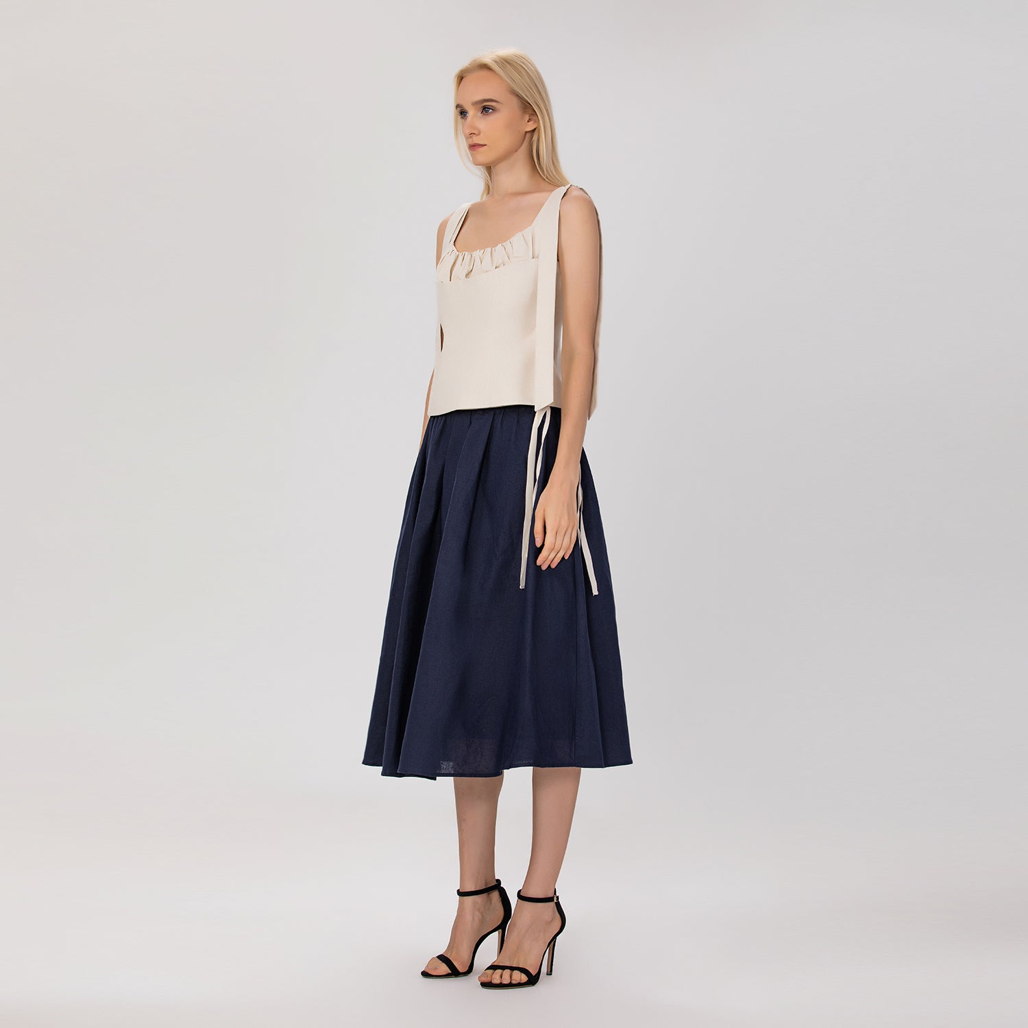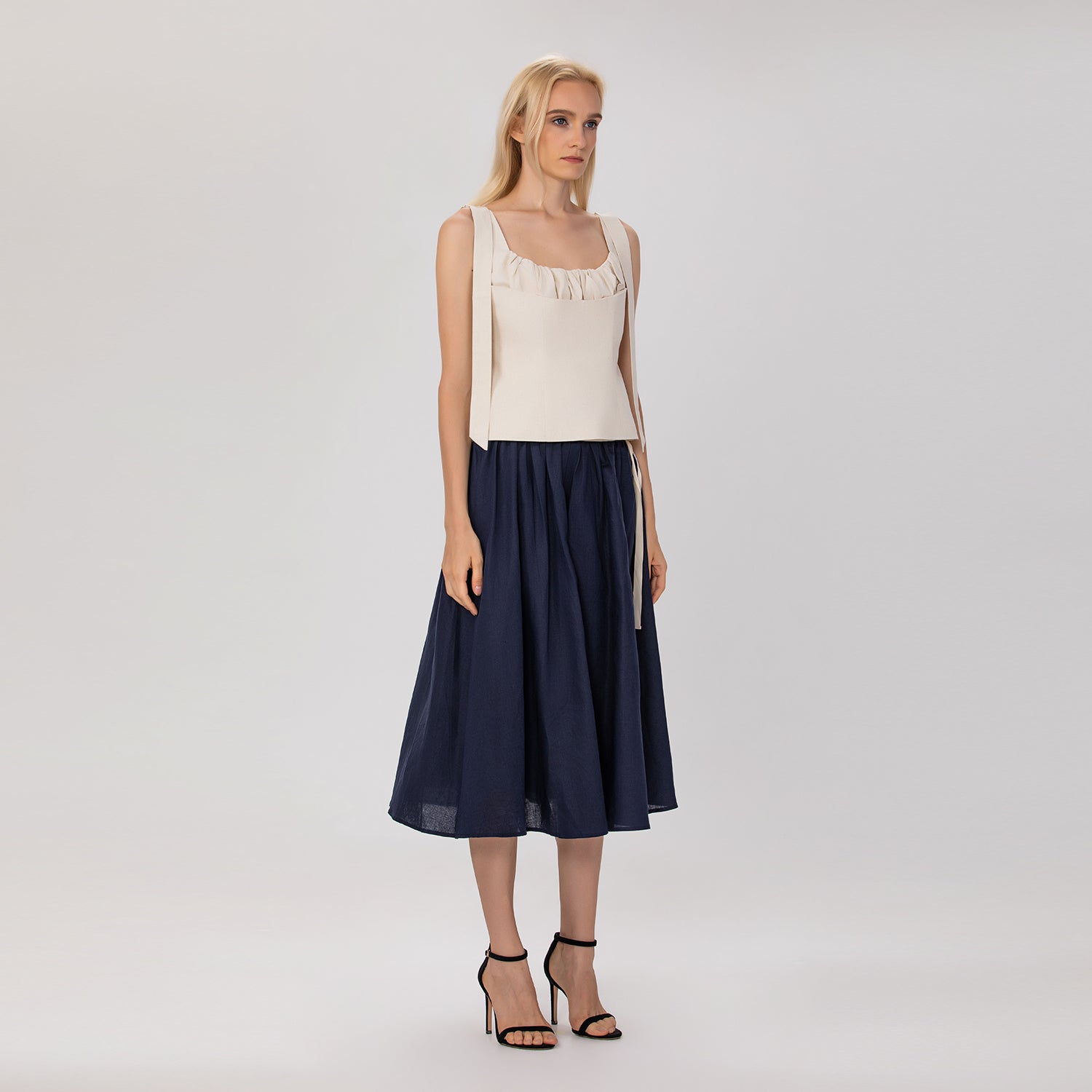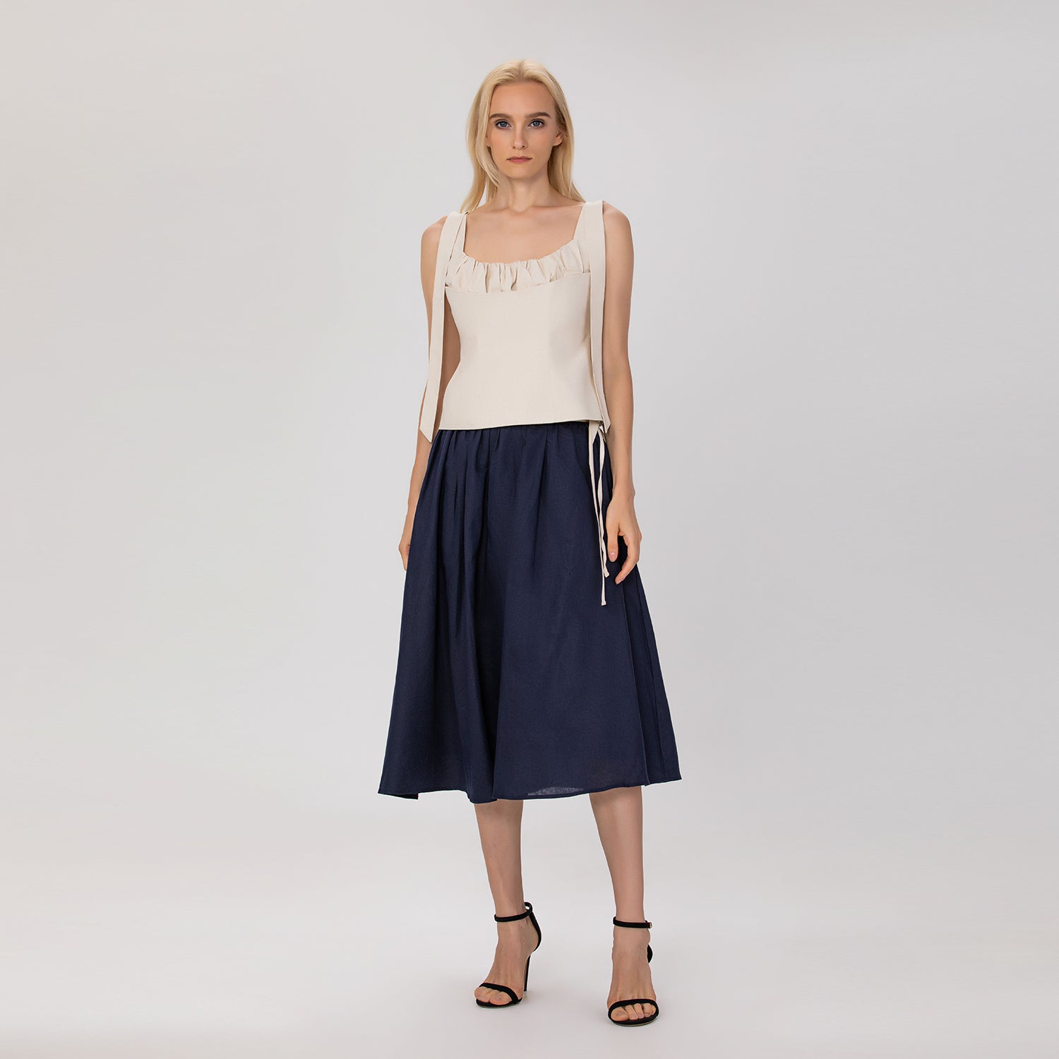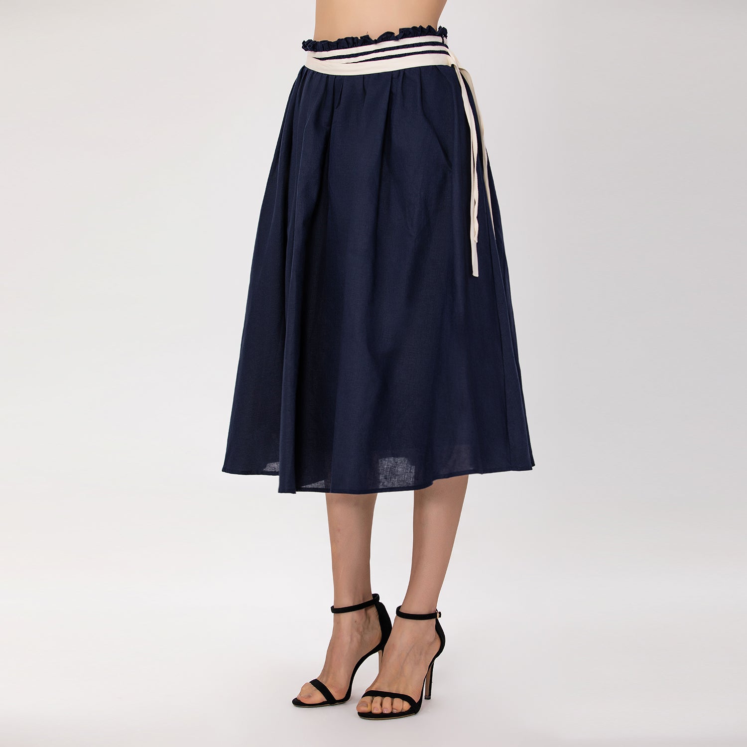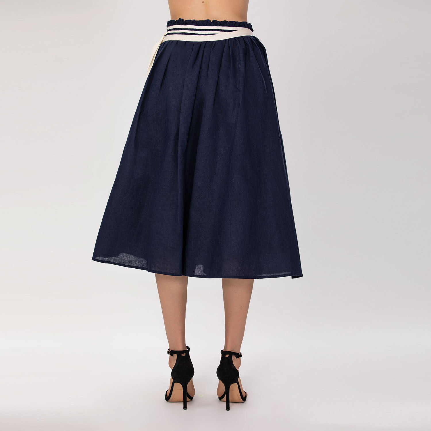 Confectionnée en lin naturel, cette jupe midi allie élégance et confort. Sa taille froncée est sublimée par une ceinture à nouer ornée d’un galon contrasté, qui souligne délicatement la silhouette et apporte une touche raffinée et féminine. Avec sa coupe évasée et fluide, elle se porte aussi bien pour un look chic que pour une allure décontractée.
