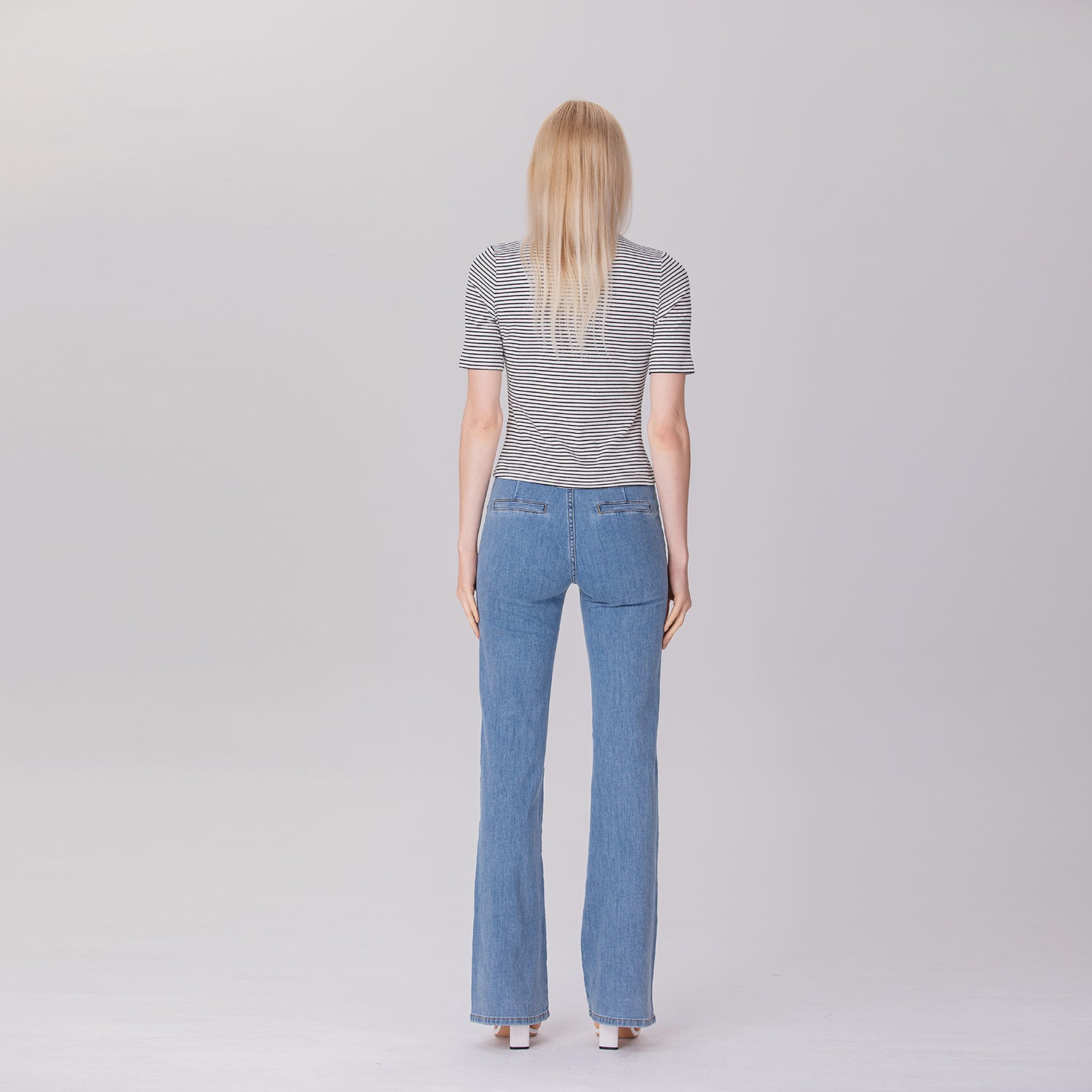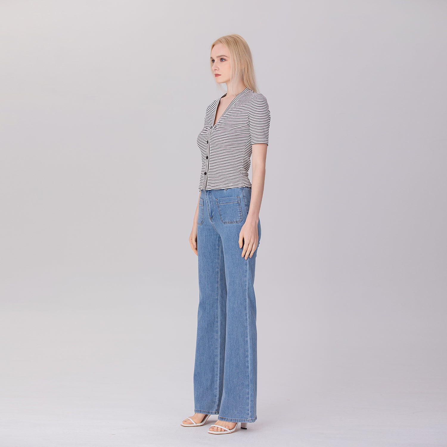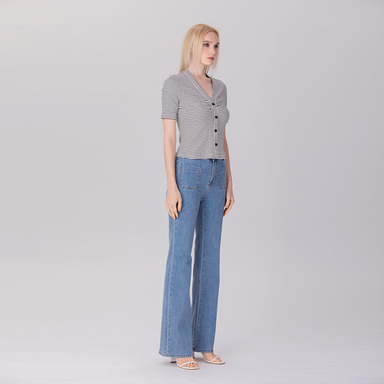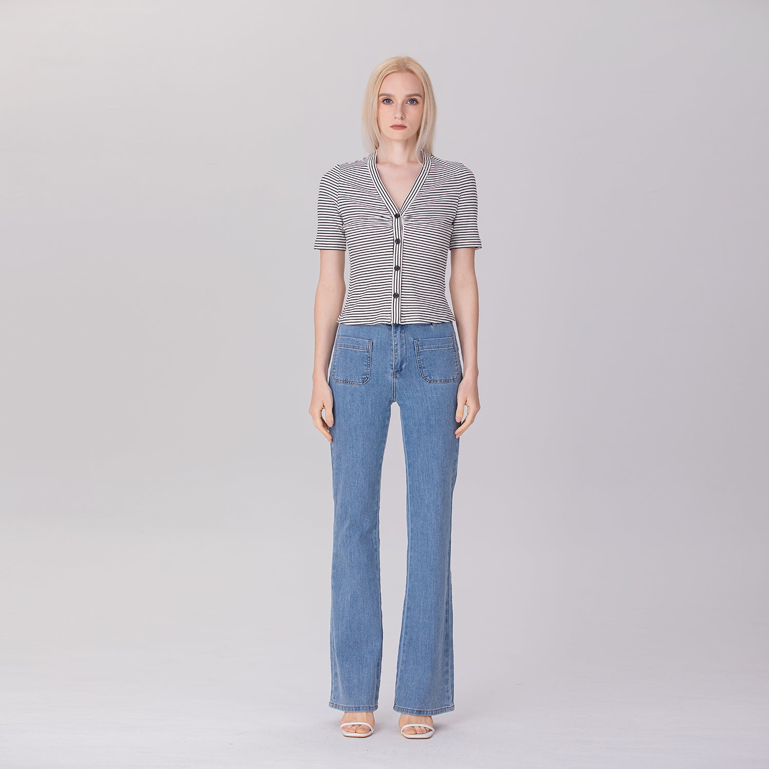 Ce chemisier en jersey associe confort et élégance grâce à sa matière douce et extensible. Confectionné en coton, il épouse la silhouette sans contraindre et se distingue par ses rayures discrètes et sa fermeture boutonnée. Sa longueur de 57,5 cm et son col en V apportent une touche féminine et moderne, idéale pour un look chic au quotidien.