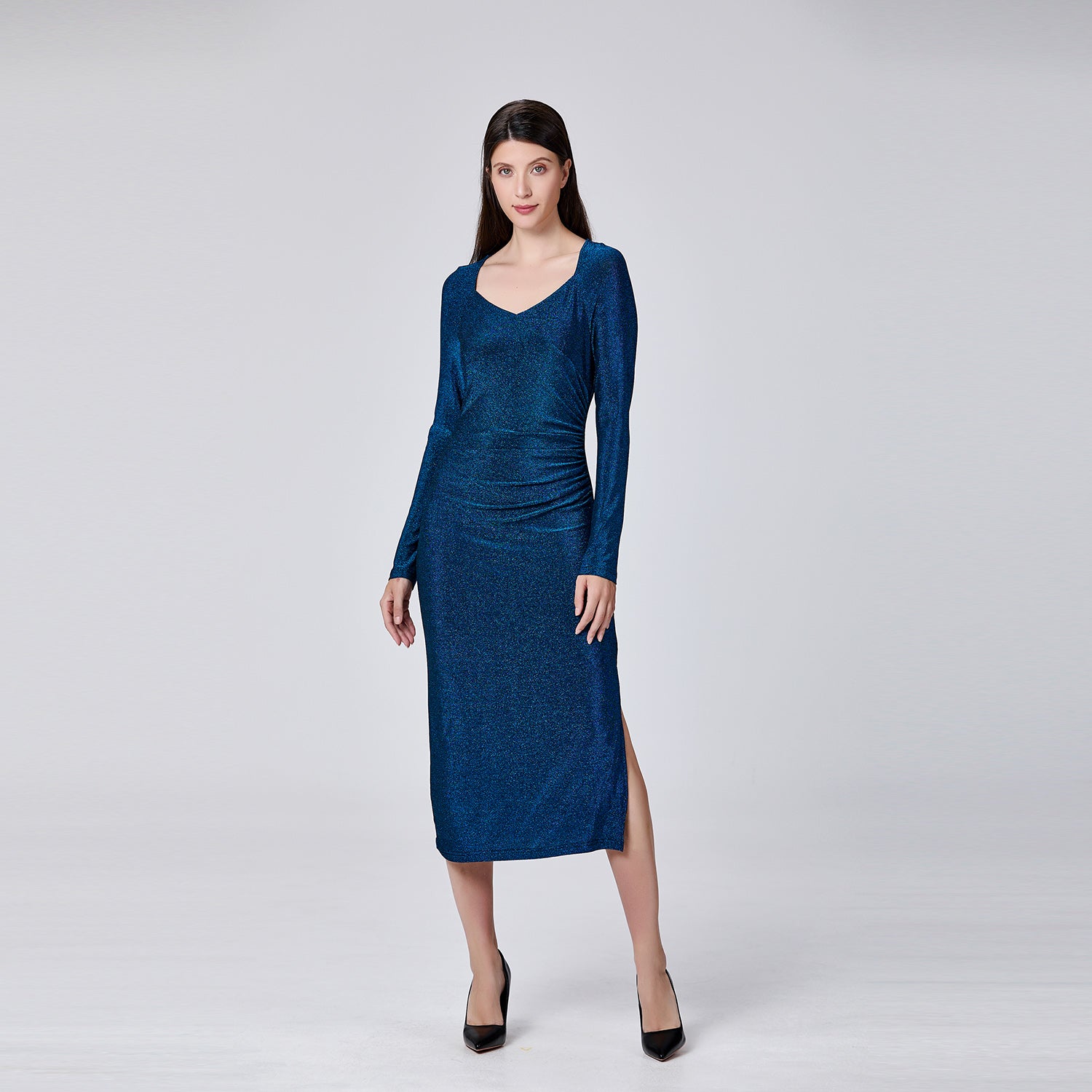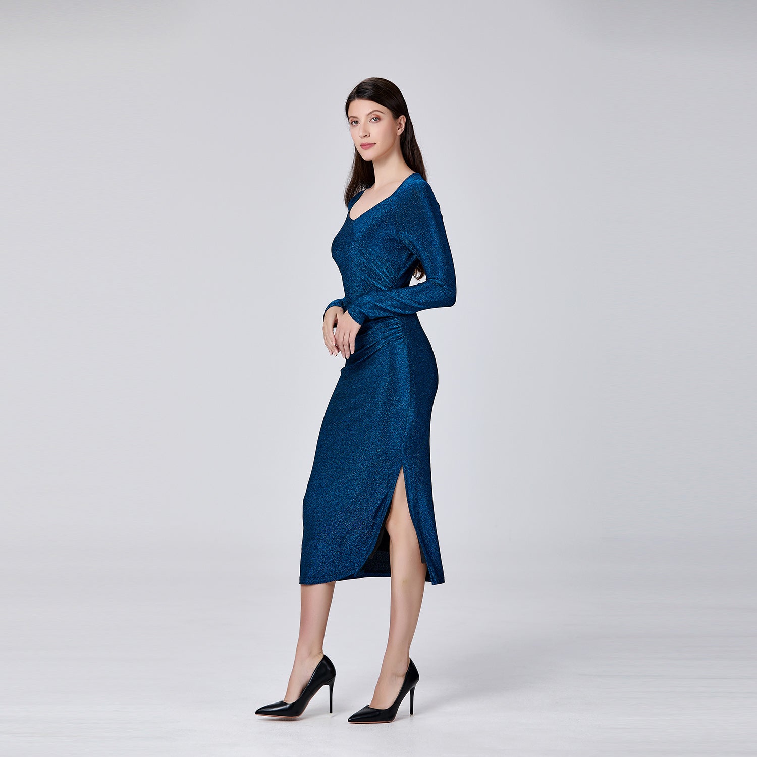 Robe fourreau en maille métallisée, une pièce scintillante qui sublime la silhouette avec éclat. Sa coupe près du corps est mise en valeur par un élégant décolleté en cœur et un drapé subtil à la taille, soulignant les formes avec finesse. Une fente latérale sur la jambe ajoute une touche de sensualité tout en facilitant le mouvement. Parfaite pour les soirées et événements où l’on souhaite briller avec élégance.