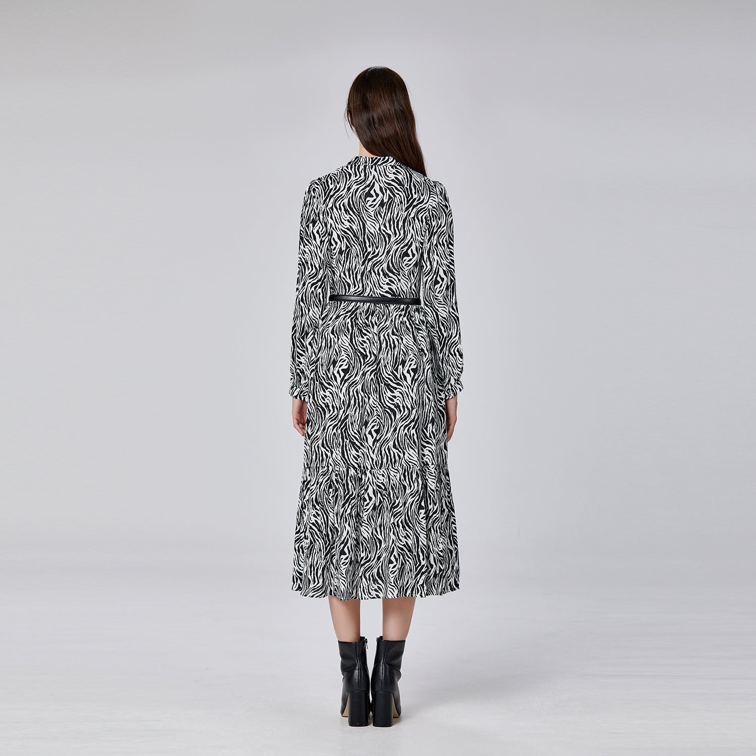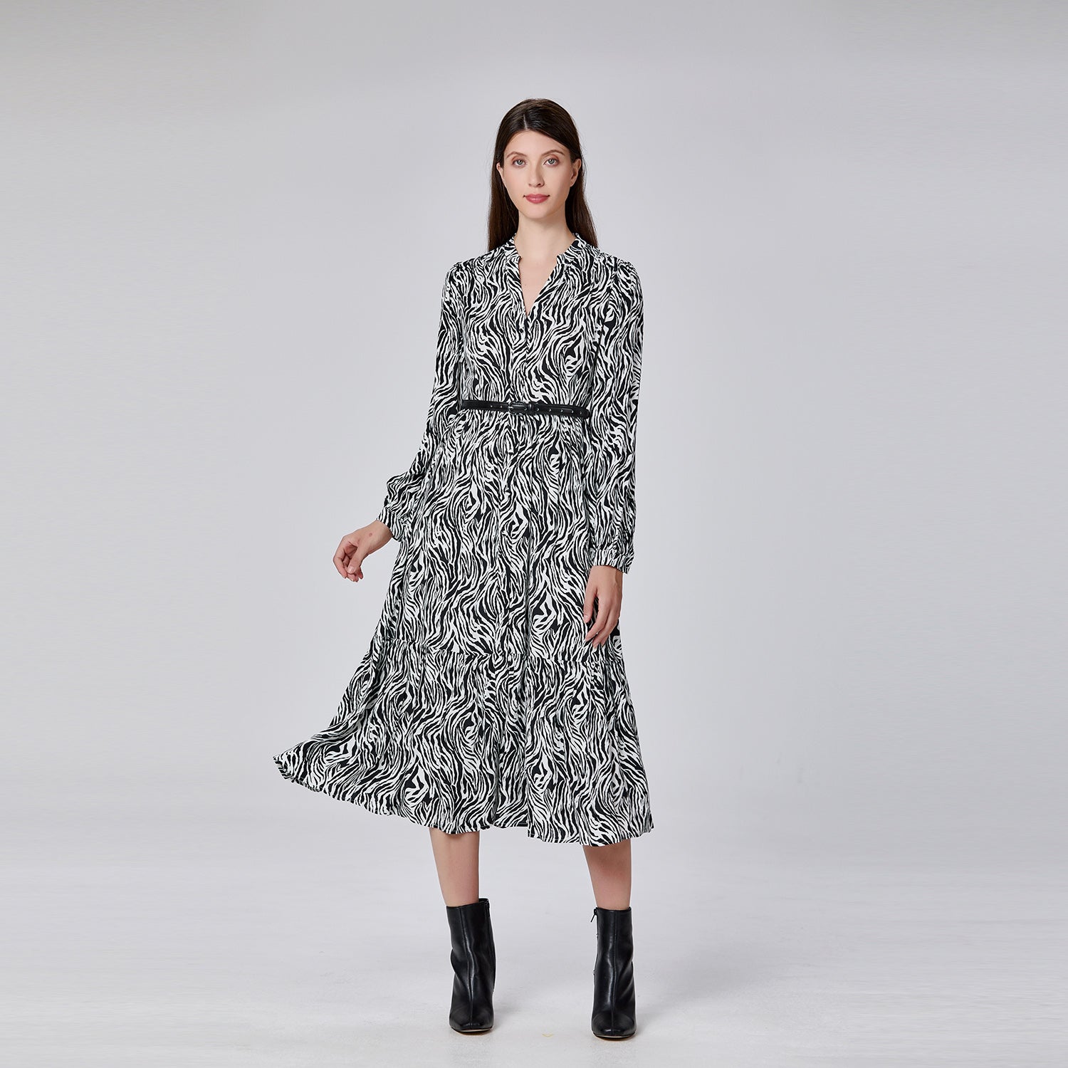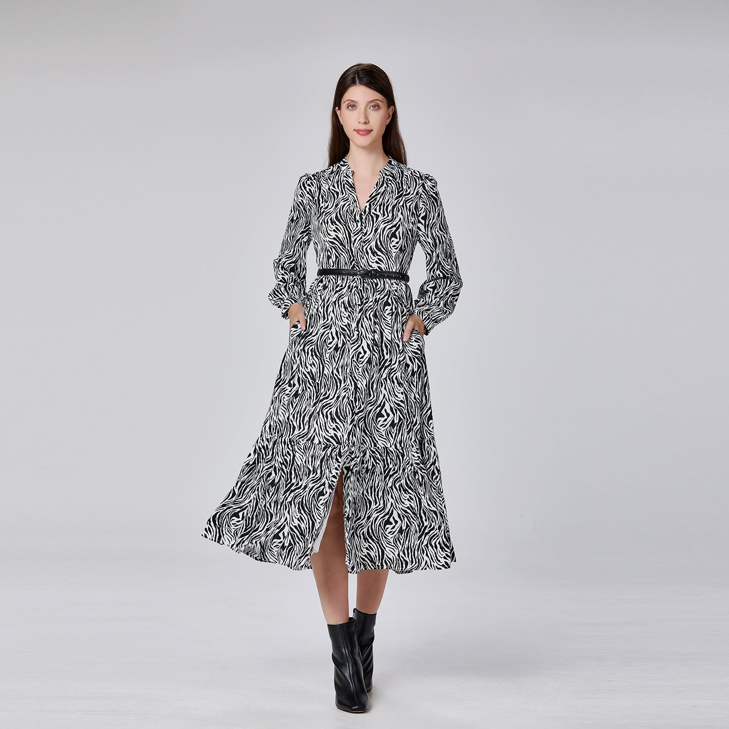 Cette robe longue séduit par son imprimé audacieux et sa silhouette fluide. Le col fendu en V apporte une touche féminine tout en allongeant la ligne du cou. Sa taille légèrement marquée souligne la silhouette avec élégance, tandis que les manches longues et les poignets boutonnés renforcent son style raffiné. Une pièce parfaite pour un look tendance au quotidien ou une allure chic en soirée.