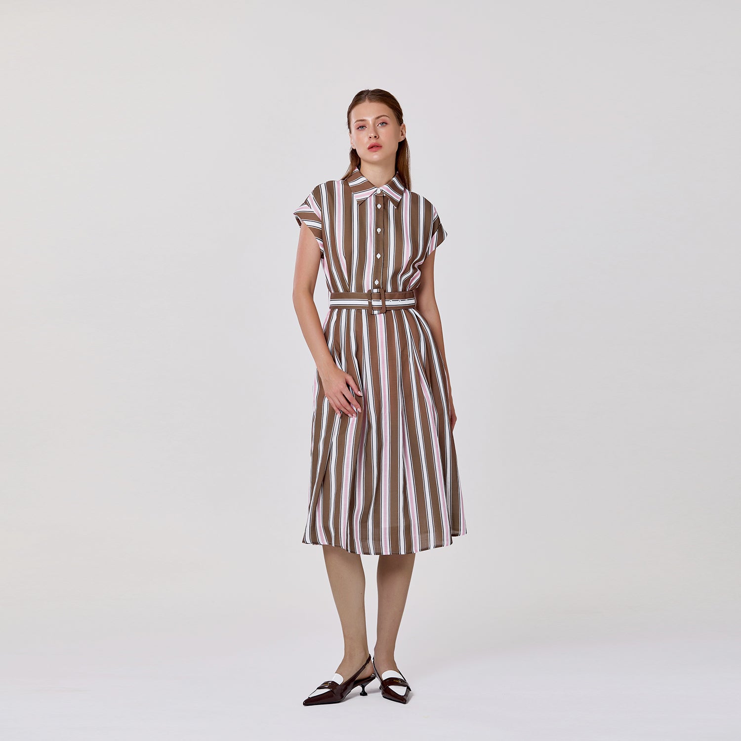 Cette robe chemise à rayures allie élégance intemporelle et confort au quotidien. Sa taille ceinturée met en valeur la silhouette, tandis que sa longueur midi et son tissu léger en font une pièce idéale aussi bien pour les sorties décontractées que pour des occasions plus habillées. Une robe polyvalente qui passe aisément du jour au soir.