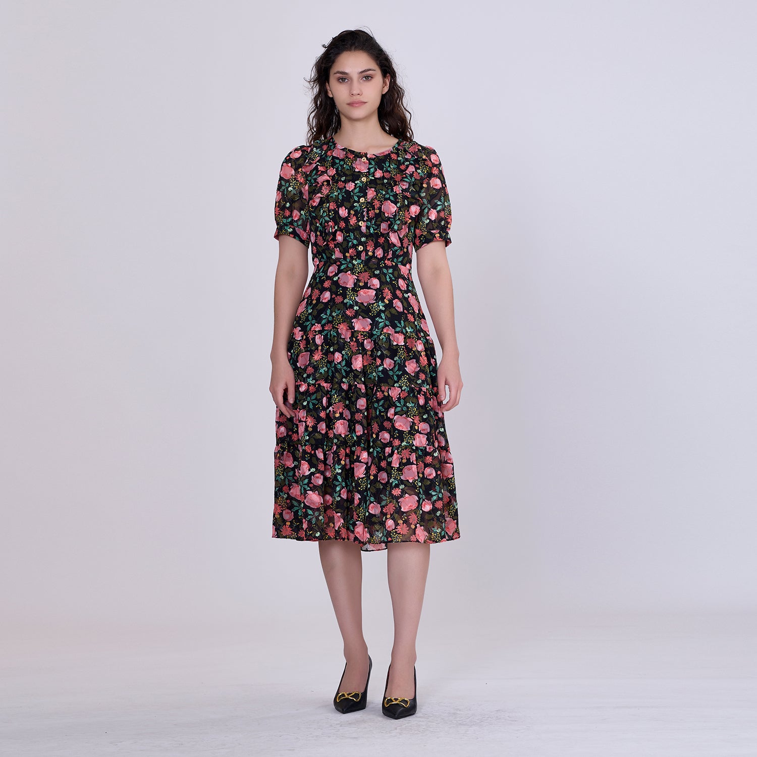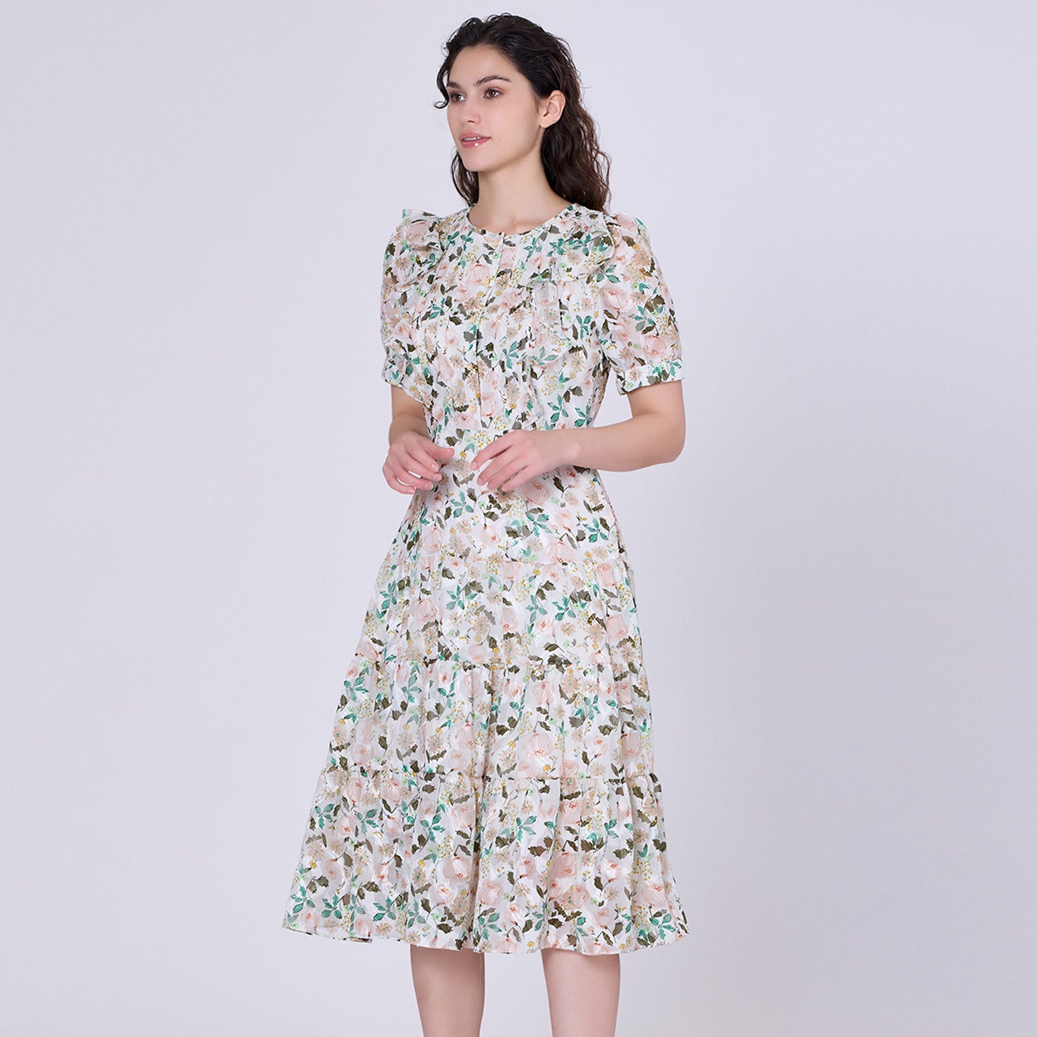 Une pièce légère et romantique coupée dans un dévoré de mousseline à imprimé floral raffiné. Buste structuré de plis religieux devant relevé de volants. Jupe évasée composée de panneaux superposés donnant un volume généreux. Une silhouette gracieuse avec la taille soulignée. Convient à des occasions semi-formelles comme un brunch, une « garden party » ou même pour assister à un mariage printanier.
