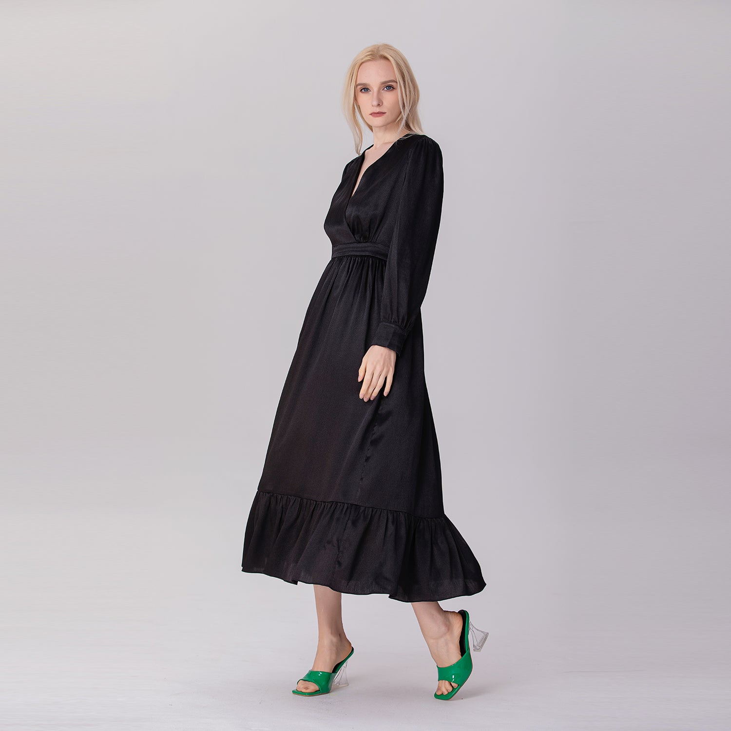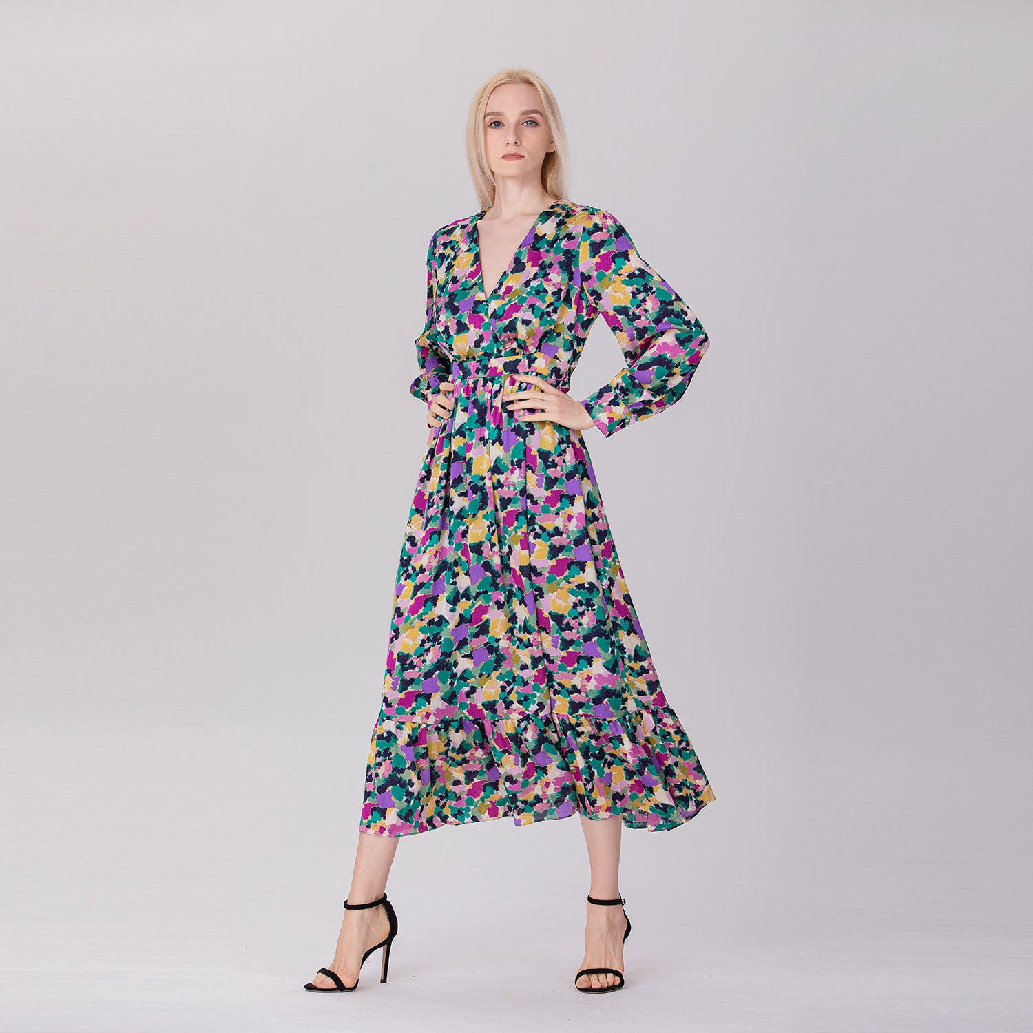 Cette robe longue à imprimé fleuri et col V incarne l’élégance et la féminité. Avec ses manches longues, sa taille cintrée et sa jupe fluide, elle dessine une silhouette gracieuse pleine de mouvement. Son motif floral éclatant apporte une touche de vitalité, tandis que sa doublure douce légèrement extensible assure confort et aisance, de jour comme de soir.