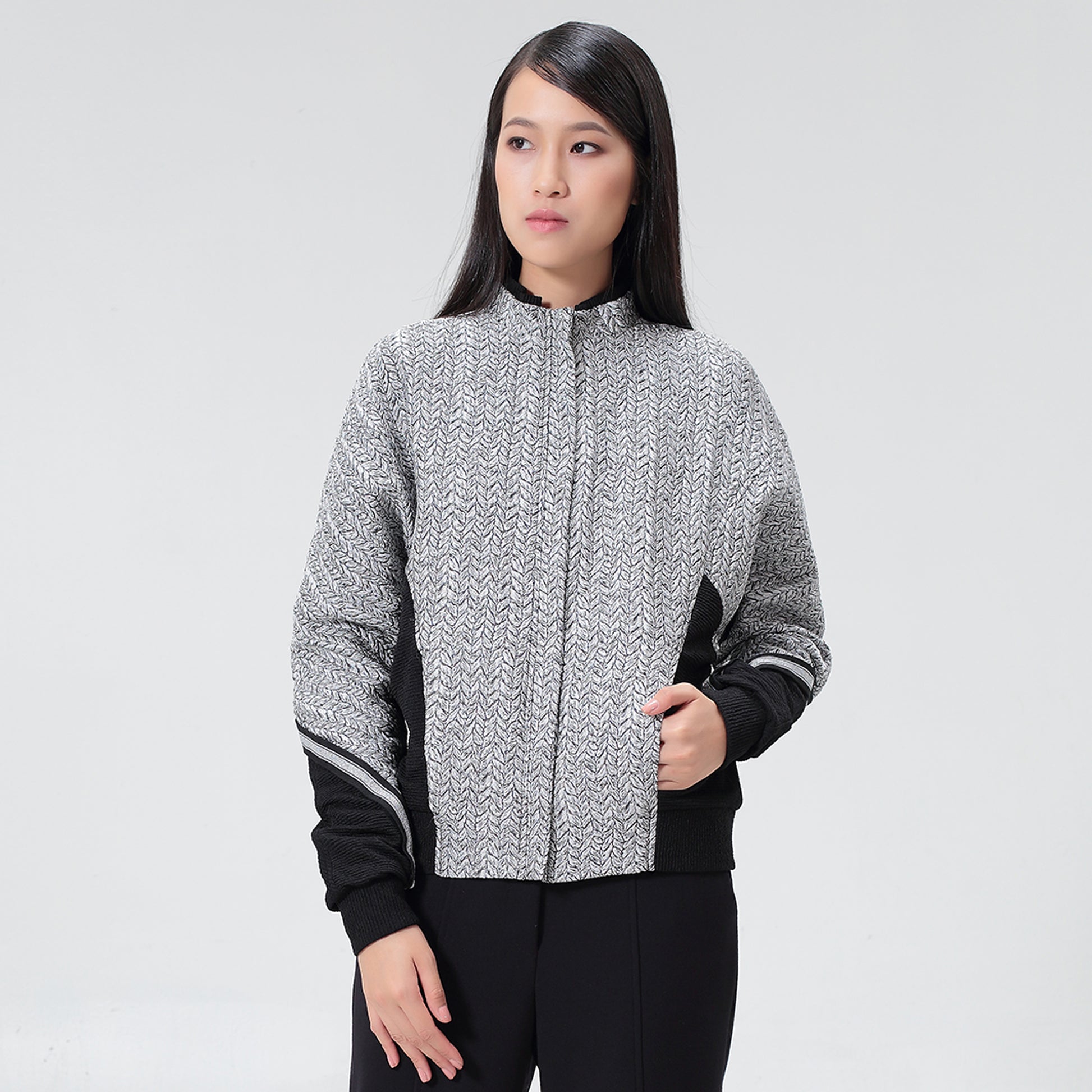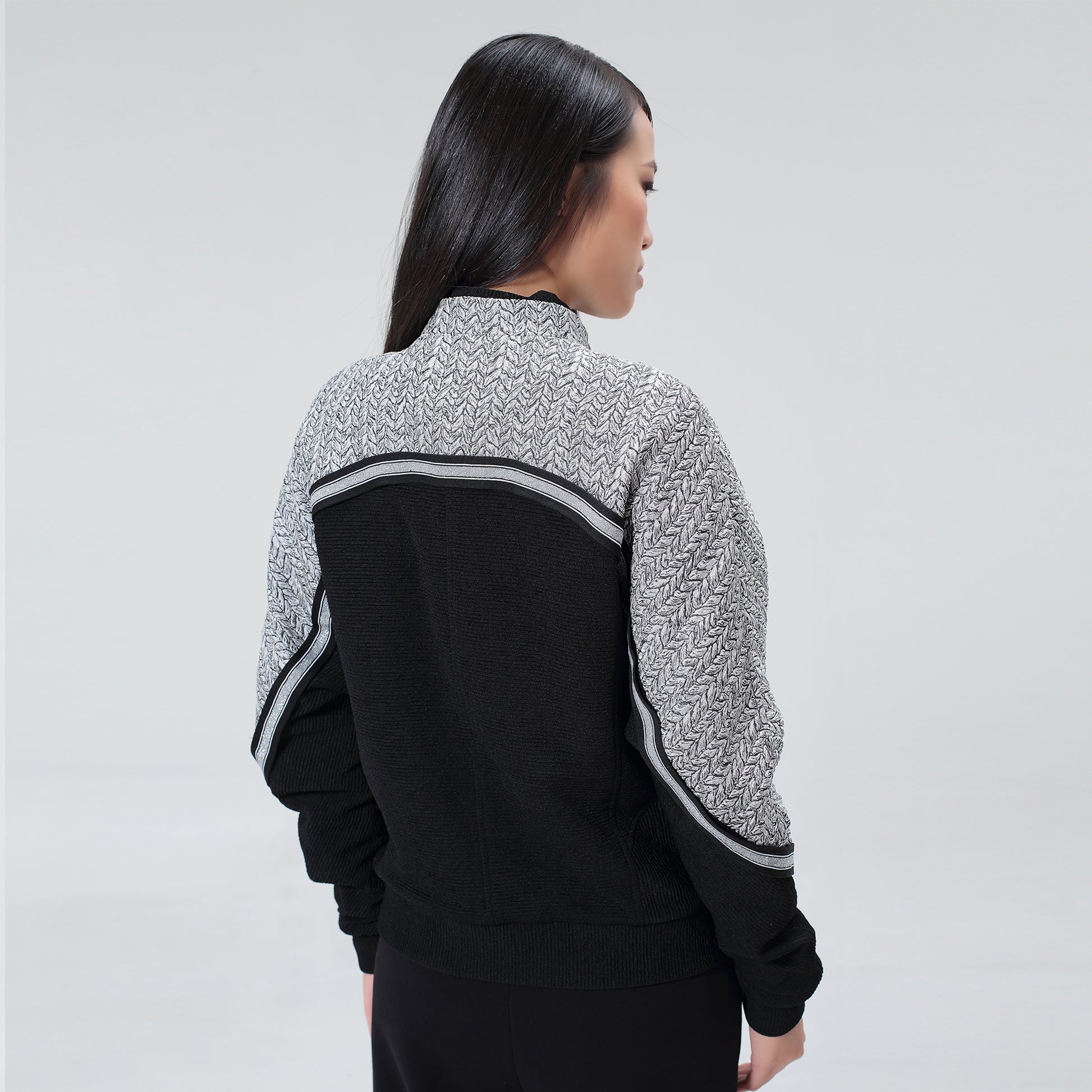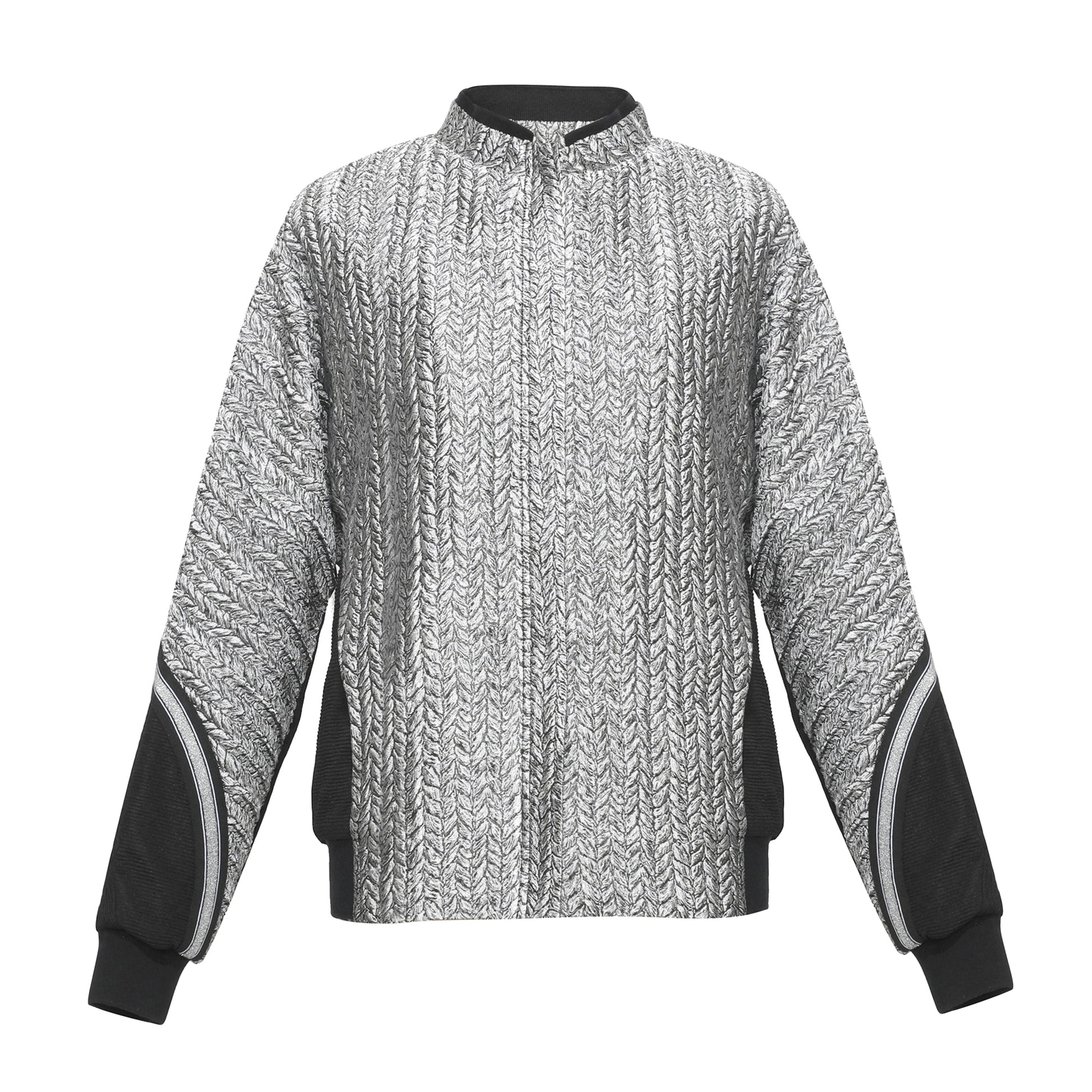 À la fois décontractée et raffinée, cette veste est un hybride qui allie à la perfection le confort et la coupe des tenues de sport à la sophistication des matières haut-de-gamme. Elle arbore un jacquard argenté à texture effet tressé et une passementerie sur les bras et le dos. Doublure satinée entièrement rembourrée, zip métal sur le devant et poches sur le côté/devant.
