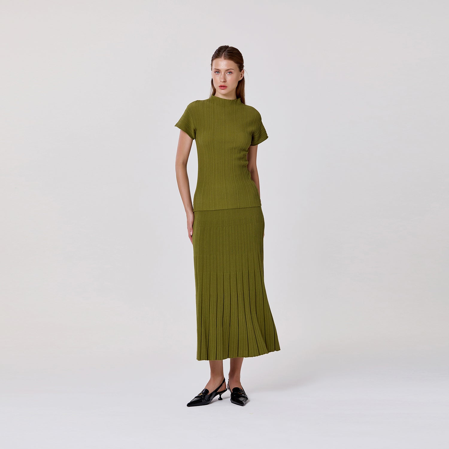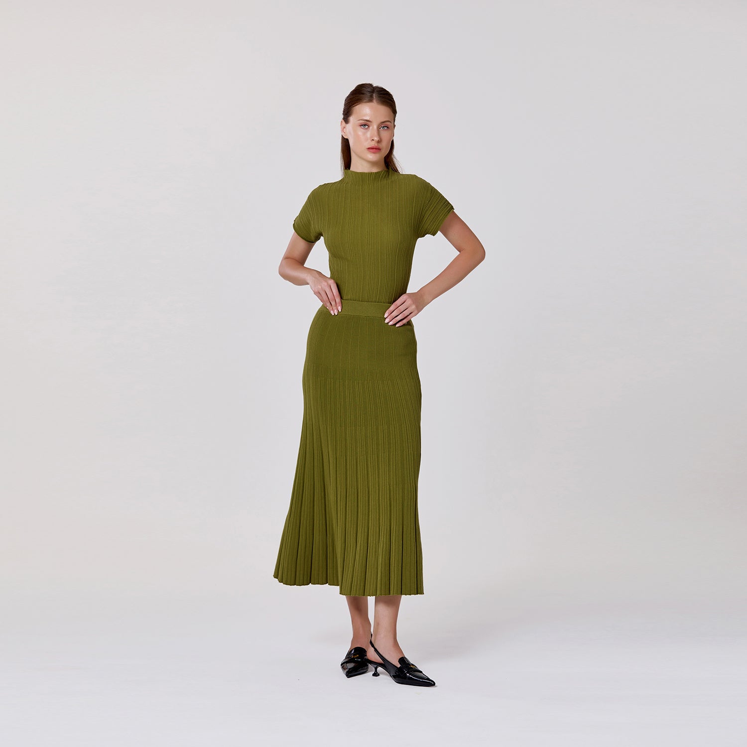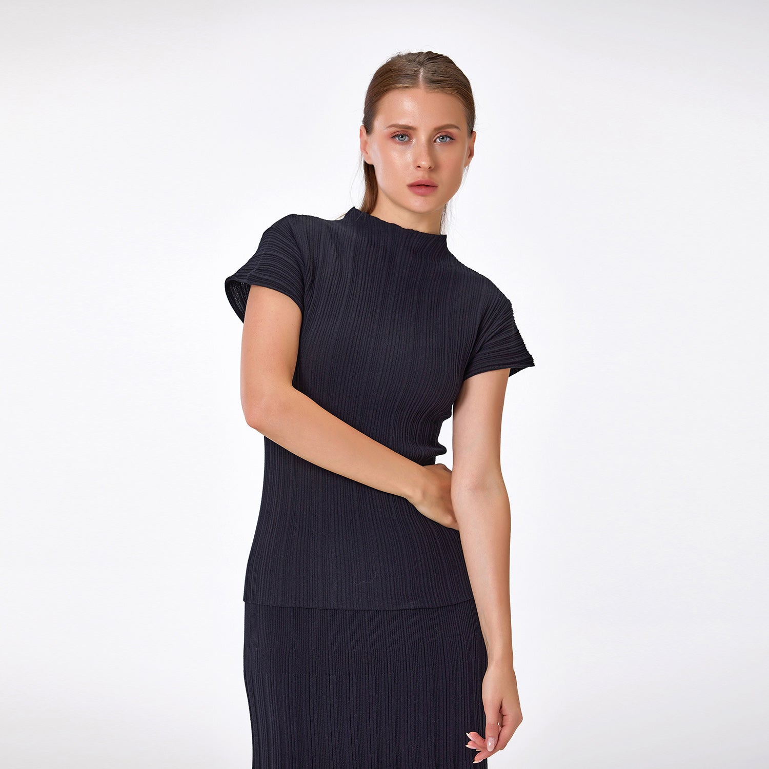 Épuré et raffiné, ce top tricoté en coton se distingue par son col montant moderne et sa maille côtelée élégante. Sa coupe ajustée souligne la silhouette tout en restant confortable grâce à la douceur naturelle du coton. Avec ses manches courtes et son design minimaliste, c’est une pièce polyvalente, idéale pour des looks chic au quotidien ou des ensembles coordonnés avec une jupe assortie.